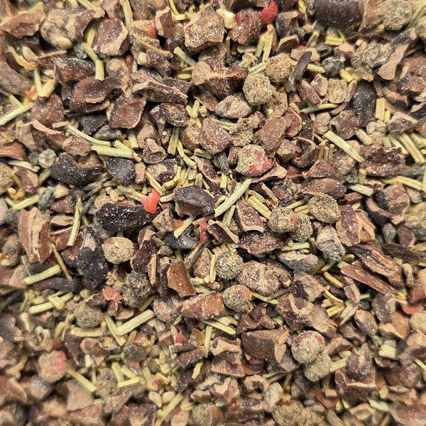 Ce mélange est conçu pour étonner et séduire. Il associe la rondeur chocolatée du cacao à la fraîcheur des poivres, à la douceur fruitée des baies roses, à la profondeur du romarin et à l’originalité des graines d’acacia. Une création qui évoque les saveurs anciennes tout en s’inscrivant dans la modernité culinaire.