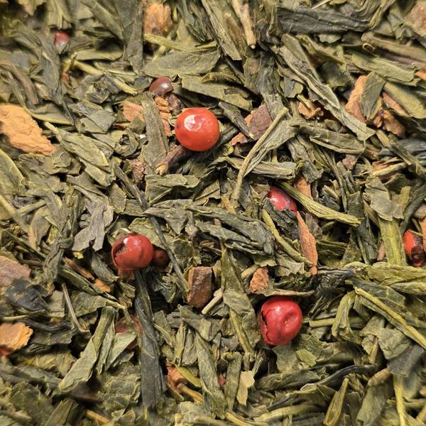Ce thé de caractère repose sur une base de thé vert Camellia sinensis, légère et fraîche. Elle met en valeur un savant mélange d’épices et de fruits : la cannelle apporte chaleur et réconfort, les baies roses ajoutent une pointe piquante et parfumée, tandis que la cranberry offre une touche fruitée et acidulée. L’huile naturelle d’orange amère vient enfin équilibrer le tout, pour une infusion vive et gourmande.